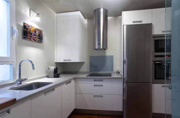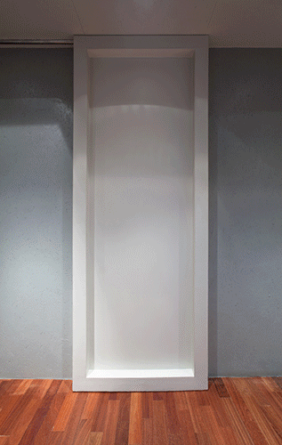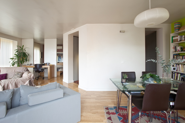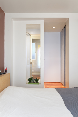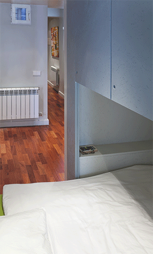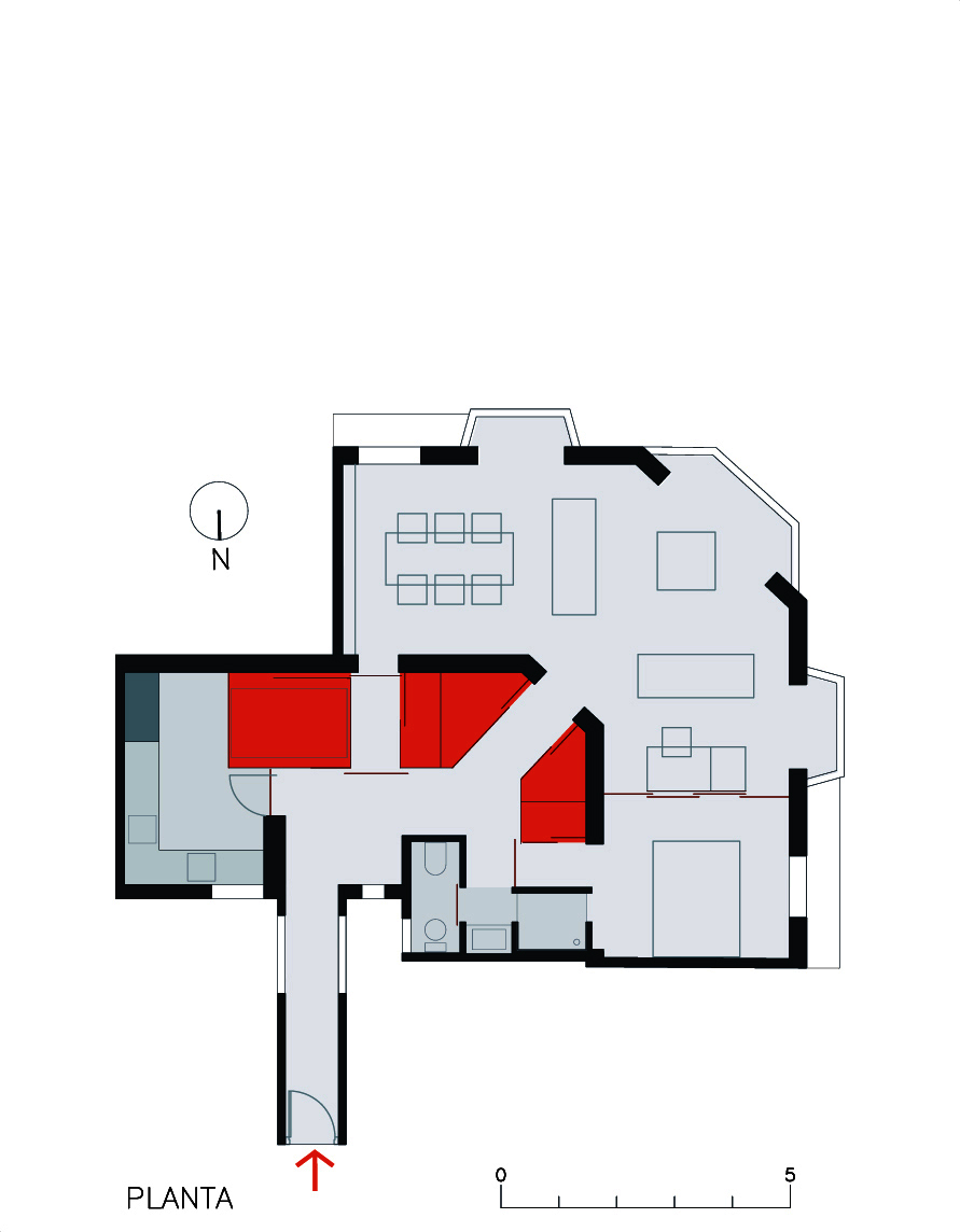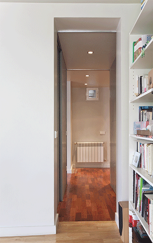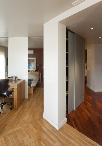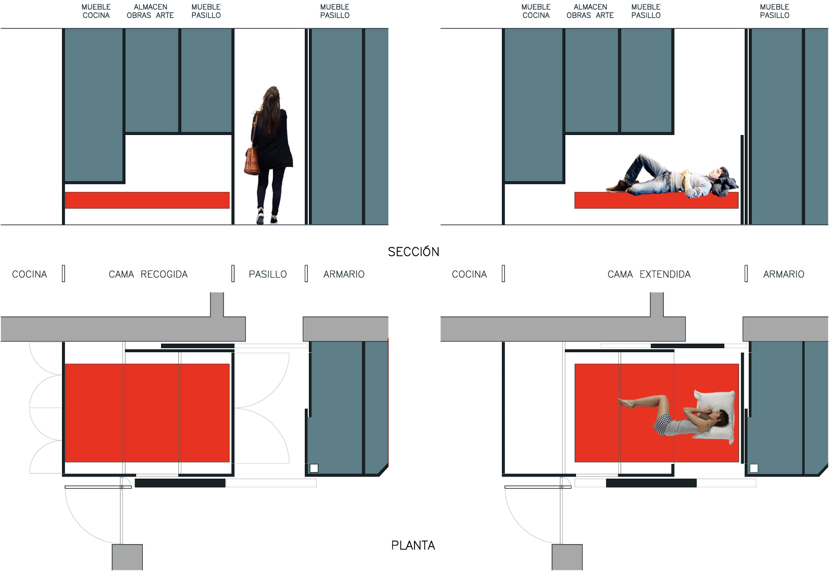Previo a este gran espacio en L existe una amplia zona previa. Aquí se sitúan dos áreas de almacenamiento y un baño. Estos tres espacios liberan tres pasillos de acceso a la zona exterior, uno de los cuales desemboca en el dormitorio principal, otro en el centro del salón y el tercero, situado junto a la cocina, incorpora la posibilidad de convertirse en dormitorio de invitados. Para ello, entre la cocina y este pasillo se construye una gran mueble intermedio. La parte superior de este mueble sirve como almacenamiento de obras de pintura, mientras que la parte inferior incorpora una cama extraíble, a modo de cajón, que se abre sobre el pasillo. Este nicho de descanso puede independizarse mediante puertas correderas.