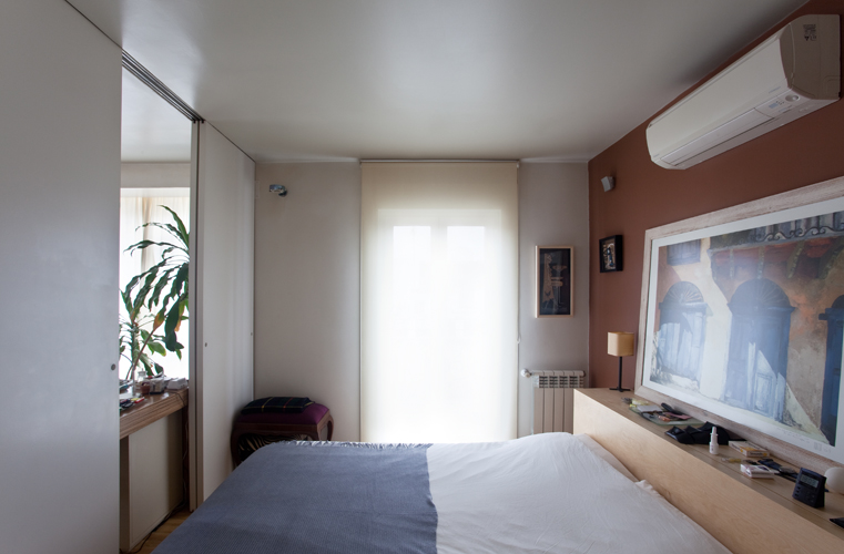Se une espacialmente toda la zona exterior de la vivienda, que tiene forma de L, y en uno de sus extremos se ubica la cama principal, con posibilidad de cerrarse mediante puertas correderas.