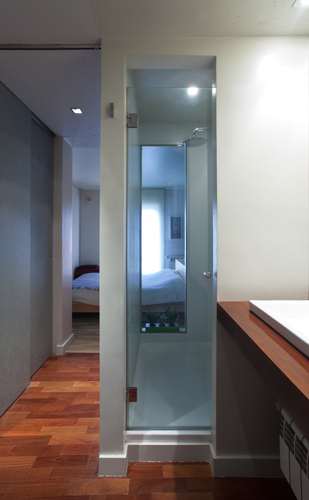 Controlando las dos puertas correderas situadas en los extremos de ese pequeño pasillo el invitado puede regular el grado de apertura o cierre que desee tener.