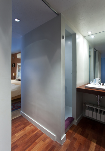 El baño contiguo dispone de una ducha acristalada sobre el dormitorio.