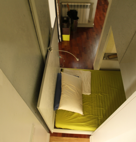 La cama de invitados surge en forma de cajón de un lado de uno de los dos pasillos de acceso a la zona exterior.