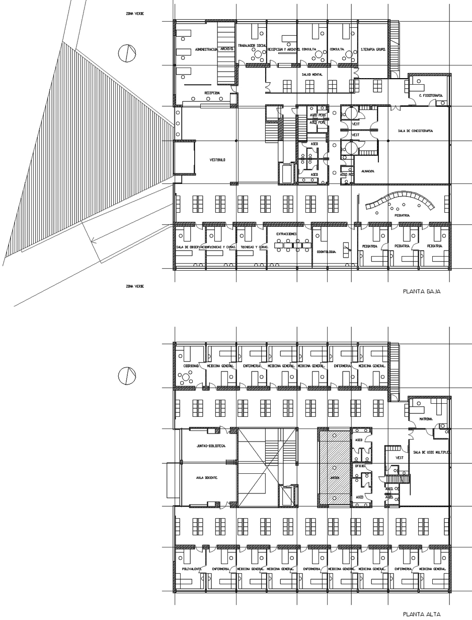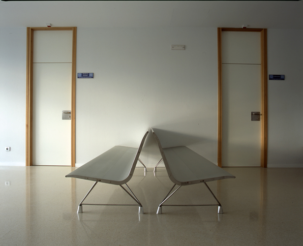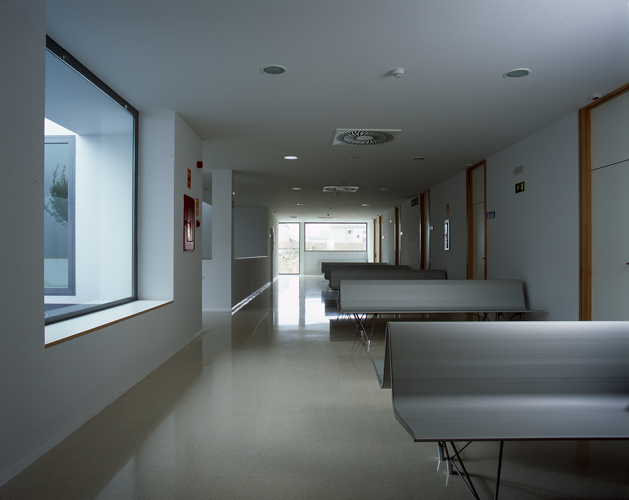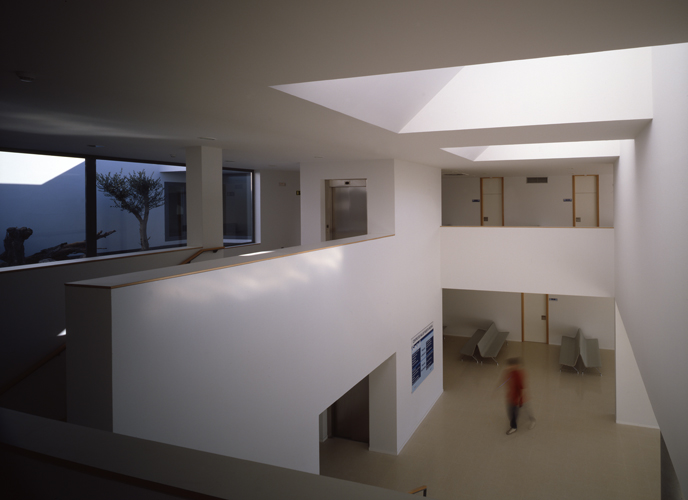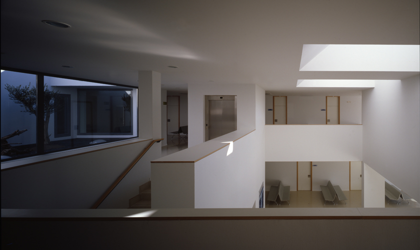 El corazón del edificio lo constituye un gran espacio central de doble altura, bajo dos grandes lucernarios. Este espacio vertebrador se expande en planta baja sobre el acceso del edificio, recibiendo iluminación horizontal a través la cristalera de acceso. En su planta alta incorpora un patio ajardinado concebido a modo de un manantial de luz y vegetación que nutre la nerviosa espera antes de entrar en consulta.