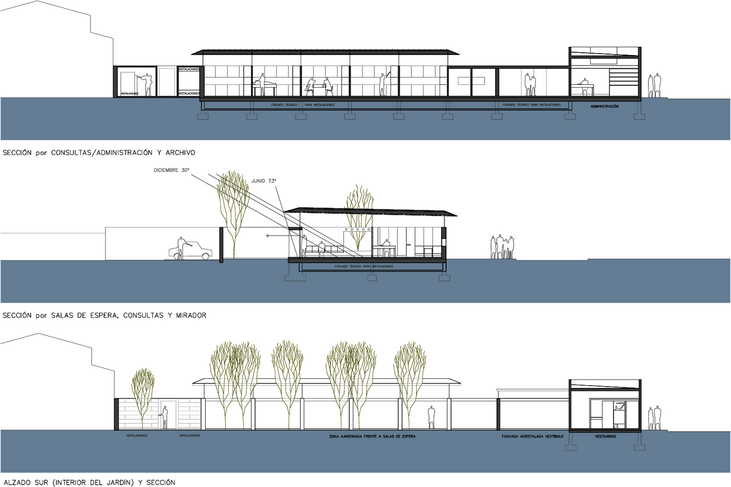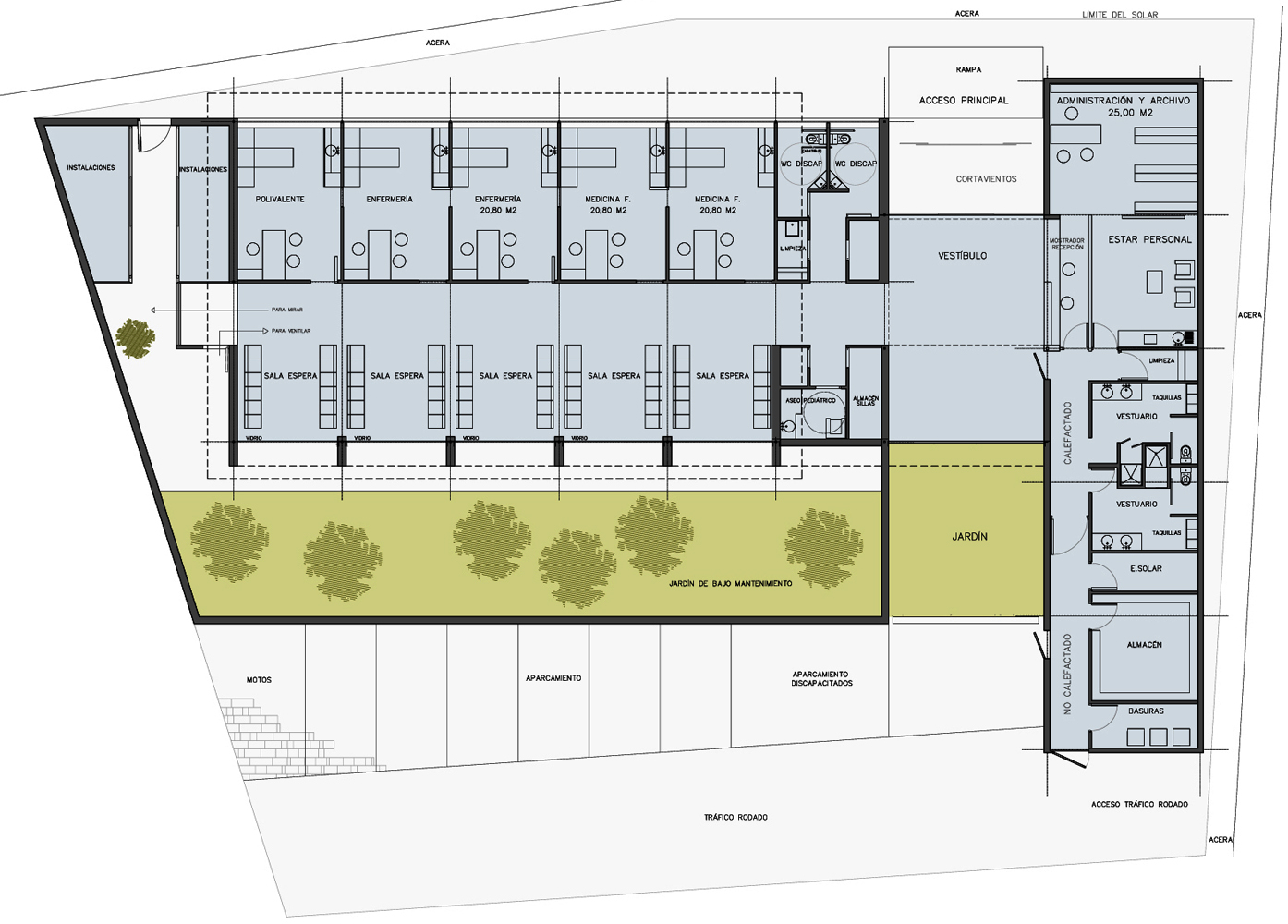 Programa de 5 consultas, esperas, administración con archivo, estar de personal y espacios anexos.