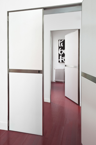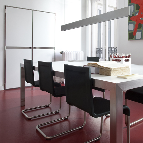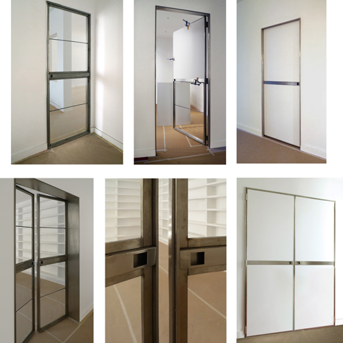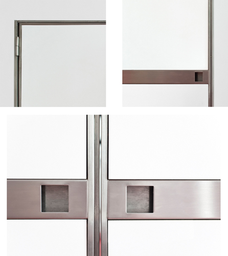 Puertas y mesas fabricadas con pletinas macizas de acero inoxidable y tableros de formica.
