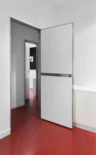 Puerta de entrada doble, estanterías de obra y una gran mesa de reuniones de acero inoxidable y formica.