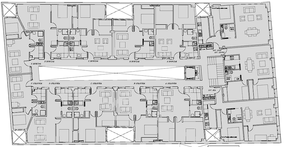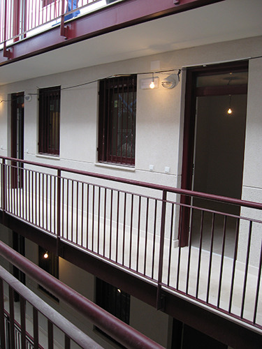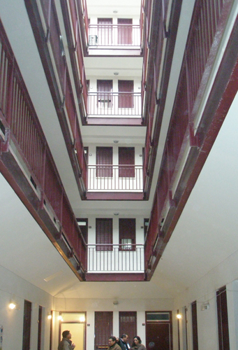 Reestructuración total de las viviendas interiores en corrala, duplicando su superficie e incorporando baños y cocinas.