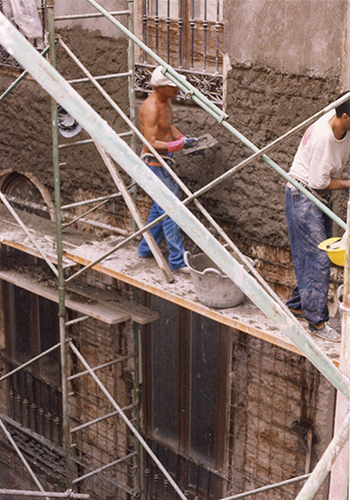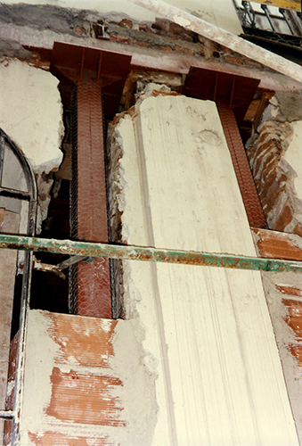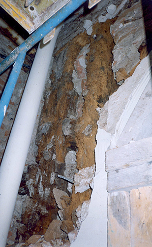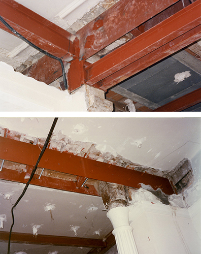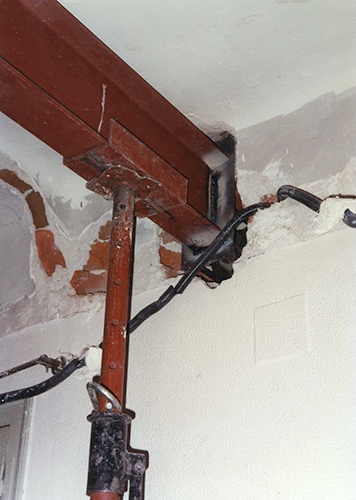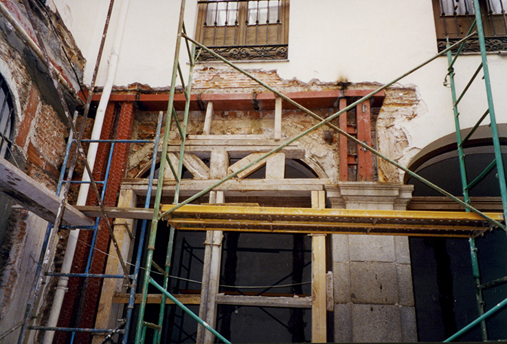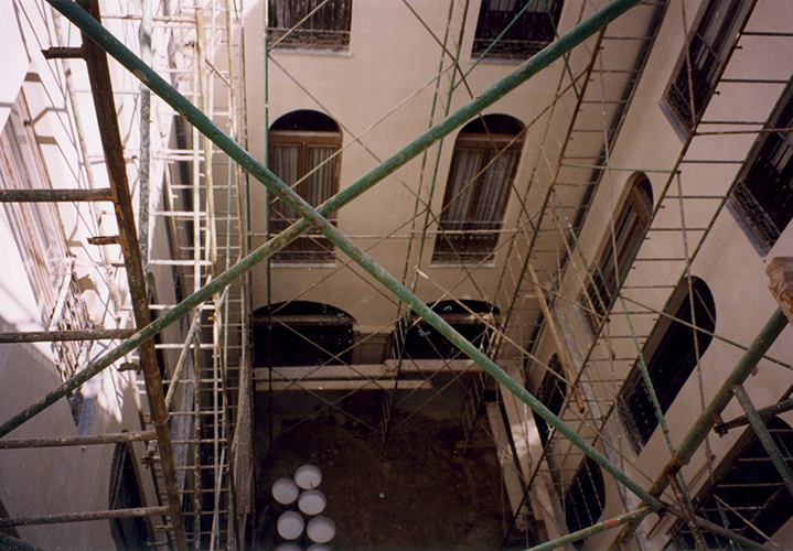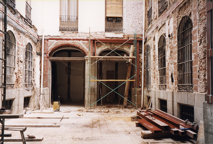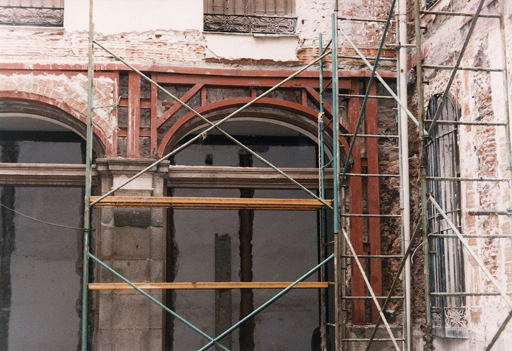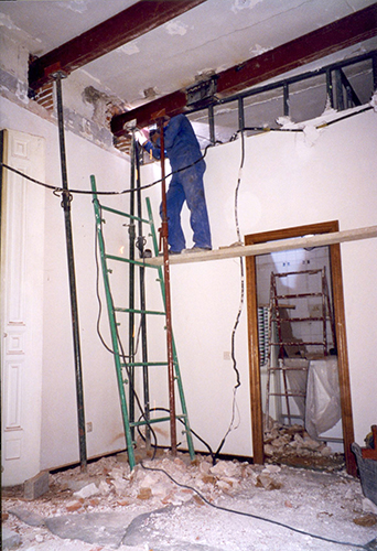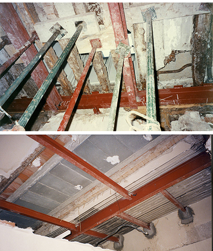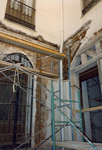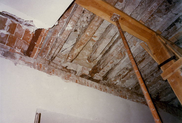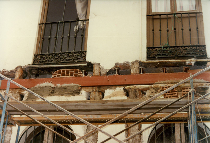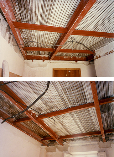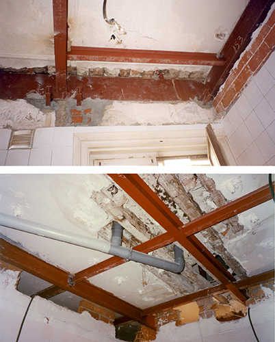 Los forjados de la primera crujía, de 5 metros de longitud, habían sido cargados con baños intermedios, sin refuerzo estructural alguno, presentando una avanzada deformación, con abundantese grietas en los tabiques.