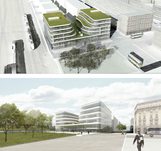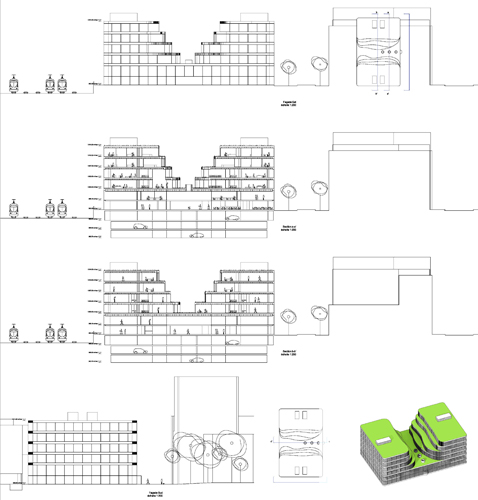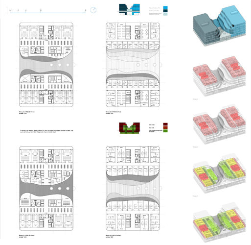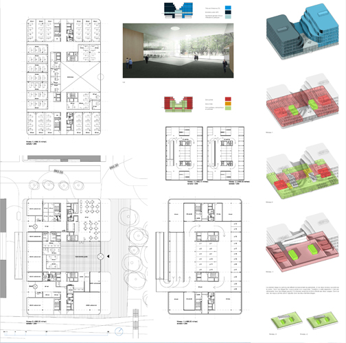 Sobre este basamento se desarrollan dos edificios paralelos, que a medida que crecen en altura van reduciendo su tamaño en planta, escalonando su parte interior, y desarrollando más programa privado y menos programa público, desapareciendo esté en las dos ultimas plantas.