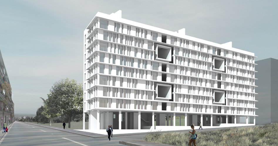 Las viviendas se disponen a los lados de un corredor que atraviesa la construcción de este a oeste. Existen dos núcleos de comunicaciones en la fachada norte y 12 viviendas por planta.