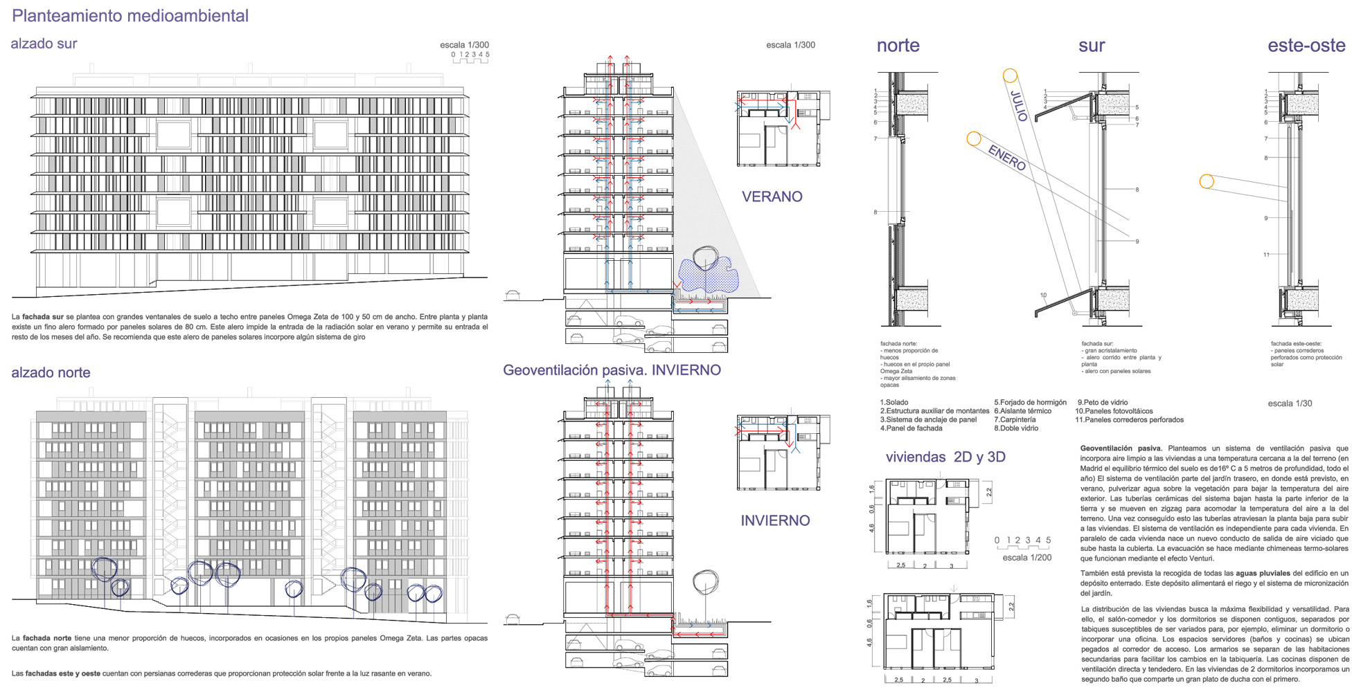 La fachada sur se plantea con grandes ventanales de suelo a techo entre paneles Omega Zeta de 100 y 50 cm de ancho. Entre planta y planta existe un fino alero formado por paneles solares de 80 cm, que impide la entrada de la radiación solar en verano, permitiendo en cambio su entrada el resto de los meses del año. Sería muy favorable que estos paneles solares incorporaran algún sistema de giro.