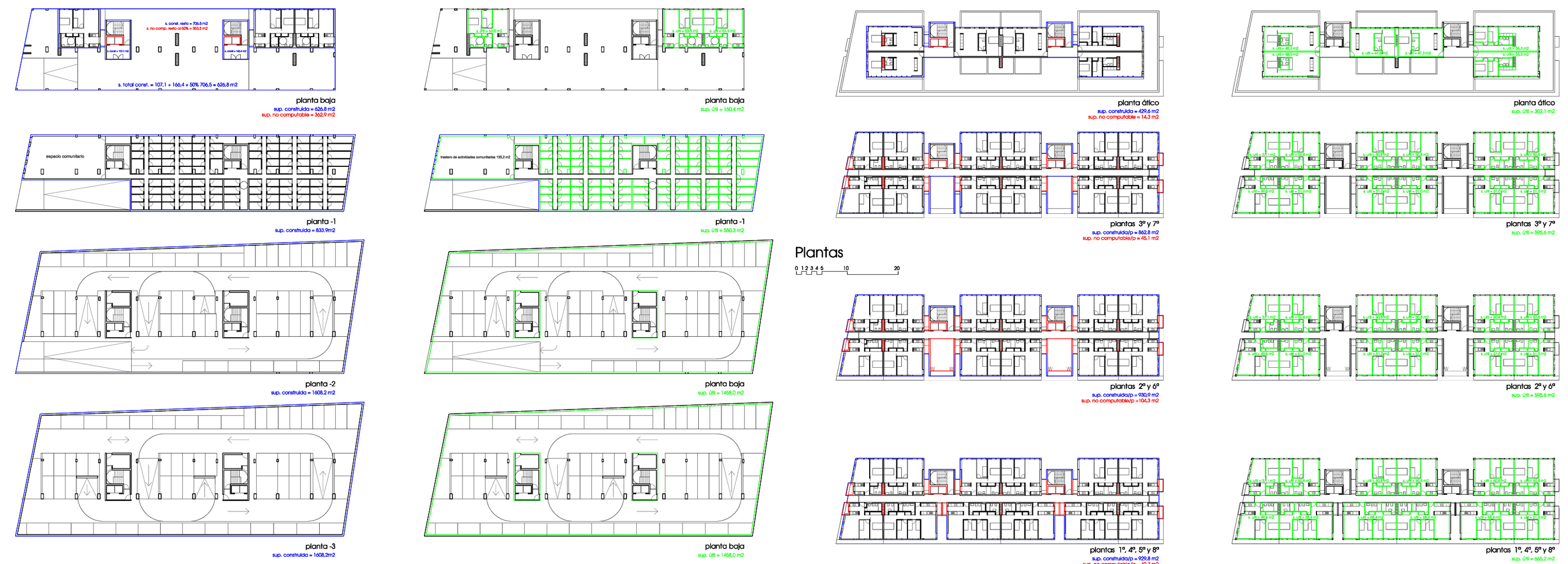 En la planta ático se ubican 6 viviendas. 4 de ellas son 1 dormitorio y 2 de 2 dormitorios. Se plantea una amplia terraza comunitaria sobre la fachada sur.